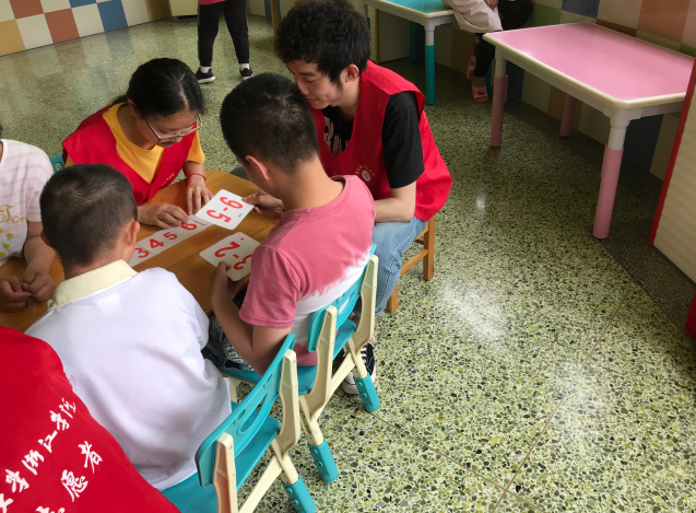 志愿者们先使用卡片教小朋友们认识数字以及进行一些简单的加法运算。然后向小朋友们展示如何还原魔方,小朋友们对志愿者哥哥能在短时间之内能迅速还原纷纷投去敬佩之目光。此外,为了孩子们能转动自己的脑筋、发挥自己的想象力,志愿者们拿出了七巧板。小朋友们一拿到七巧板,都迫不及待去拼各式各样的形状,拼完还不忘向哥哥姐姐们展示自己的智慧成果,在得到哥哥姐姐的赞美之后,露出自信的微笑